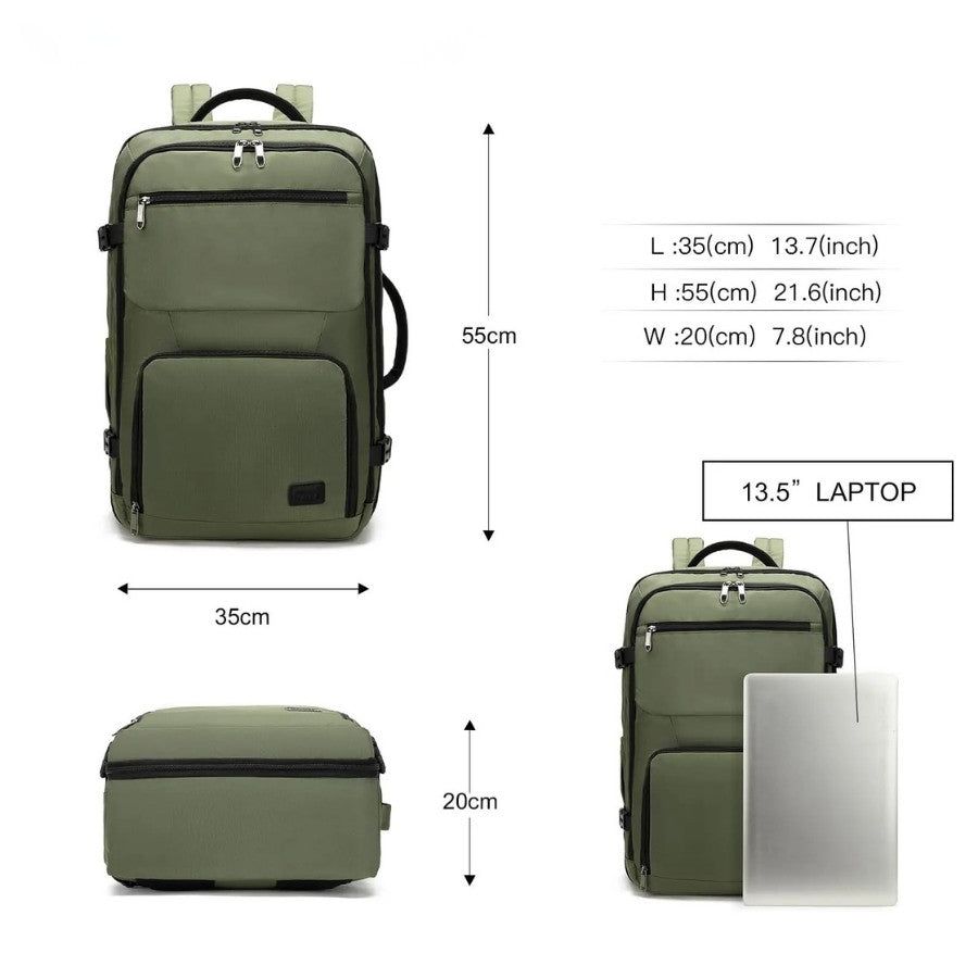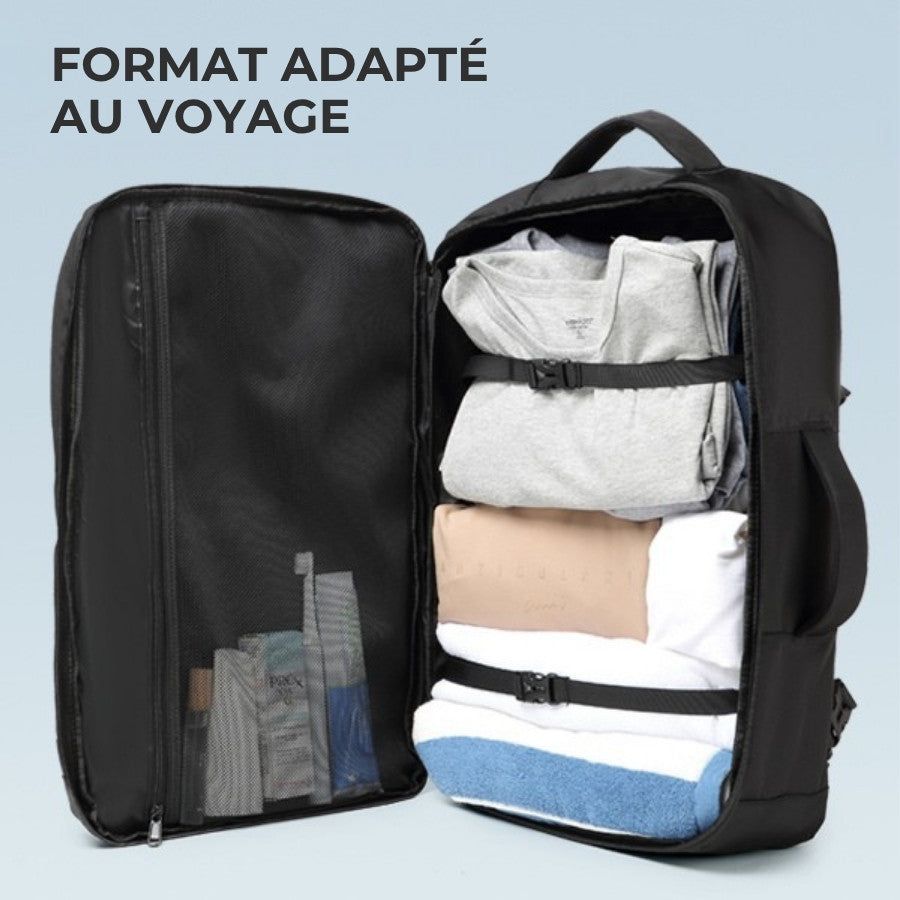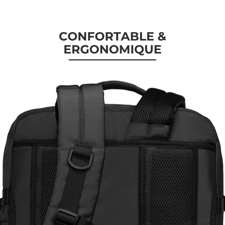 Conçu pour éviter le désordre en voyage, il offre un rangement visuel et logique : poches filet pour les accessoires, sangles pour maintenir les vêtements, compartiment matelassé, et dos ergonomique aéré pour réduire la chaleur. Sur le trajet, il reste stable grâce aux sangles de compression et se fixe facilement sur une valise à roulette pour soulager les épaules. Résultat : un bagage cabine plus pratique qu’une valise classique, qui suit votre rythme plutôt que de le ralentir.