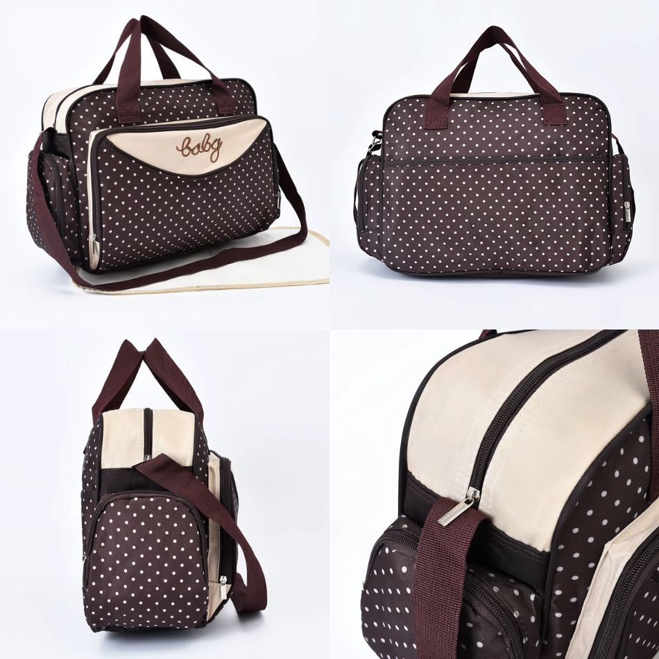 Disponible en bleu marine et marron, ce sac allie style et confort. Les poignées robustes et la bandoulière permettent un transport facile et adapté à votre mode de vie. Que vous alliez à la crèche ou en week-end, ce sac à langer motif pois rehaussera votre look tout en offrant praticité et facilité d’organisation.