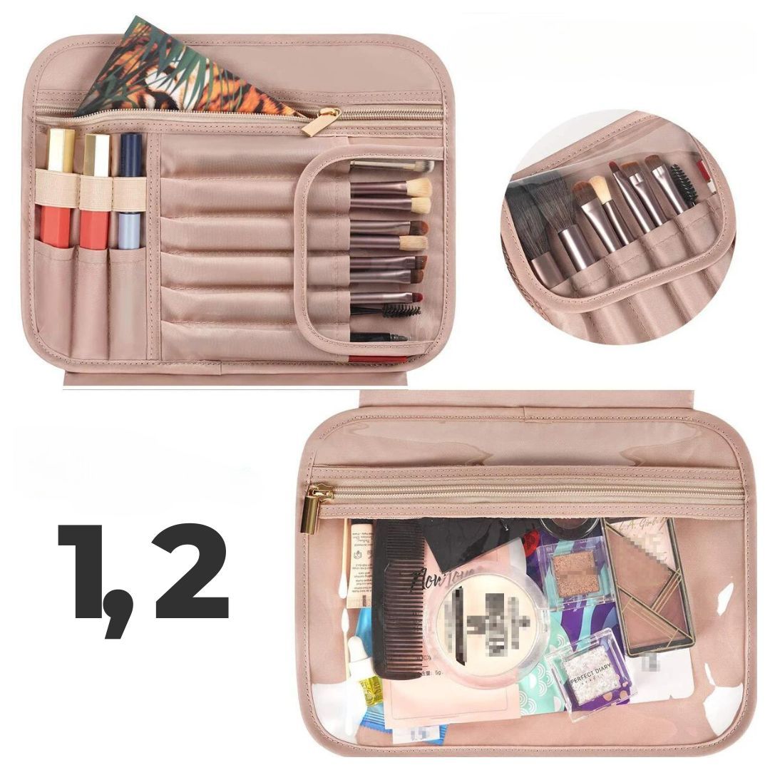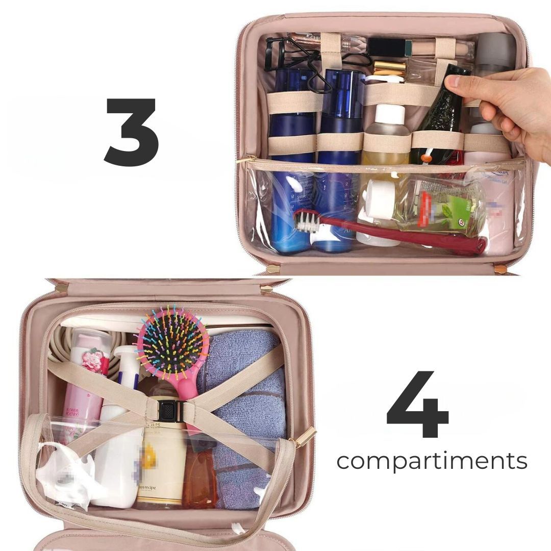 - Compartiments : poches et compartiments transparents + élastiques de maintien + compartiments dédiés au maquillage + un compartiment externe.