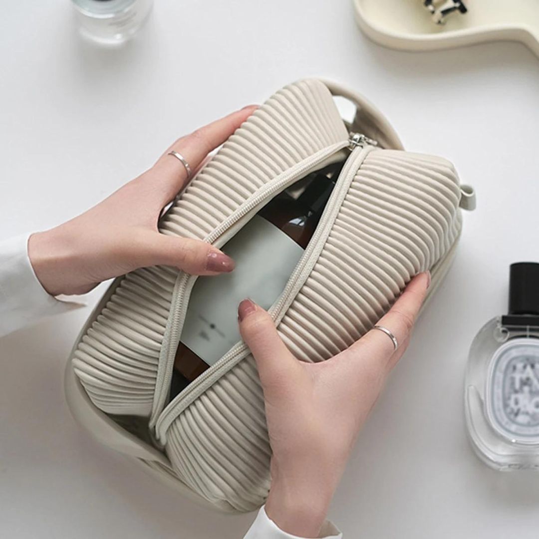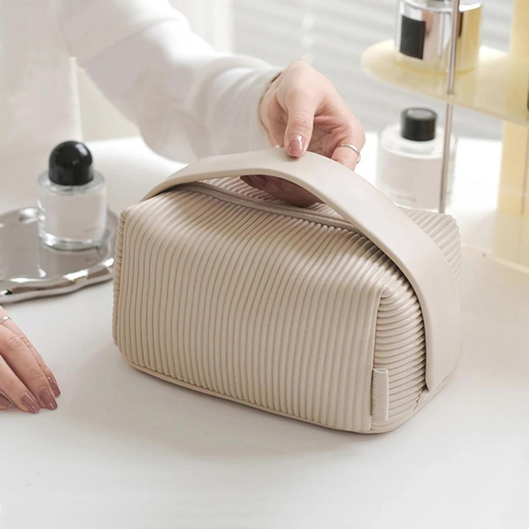 - Avec son coloris crème et ses motifs striés, cette trousse de toilette incarne l’élégance intemporelle, ajoutant une touche de sophistication à votre routine de voyage.