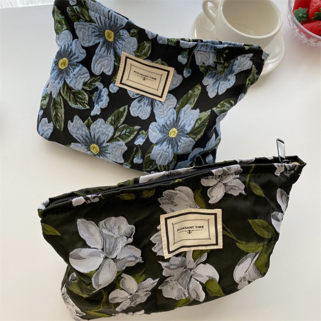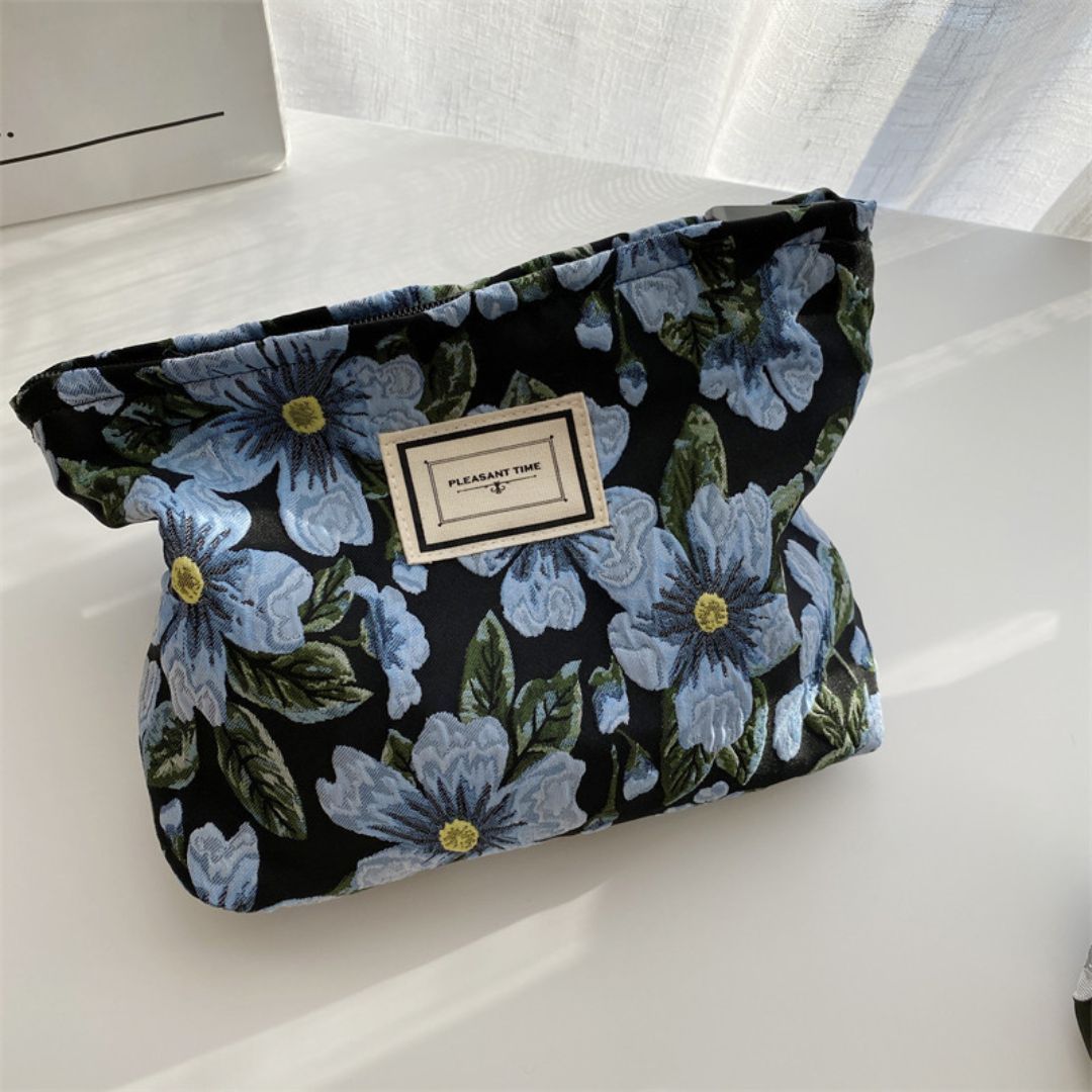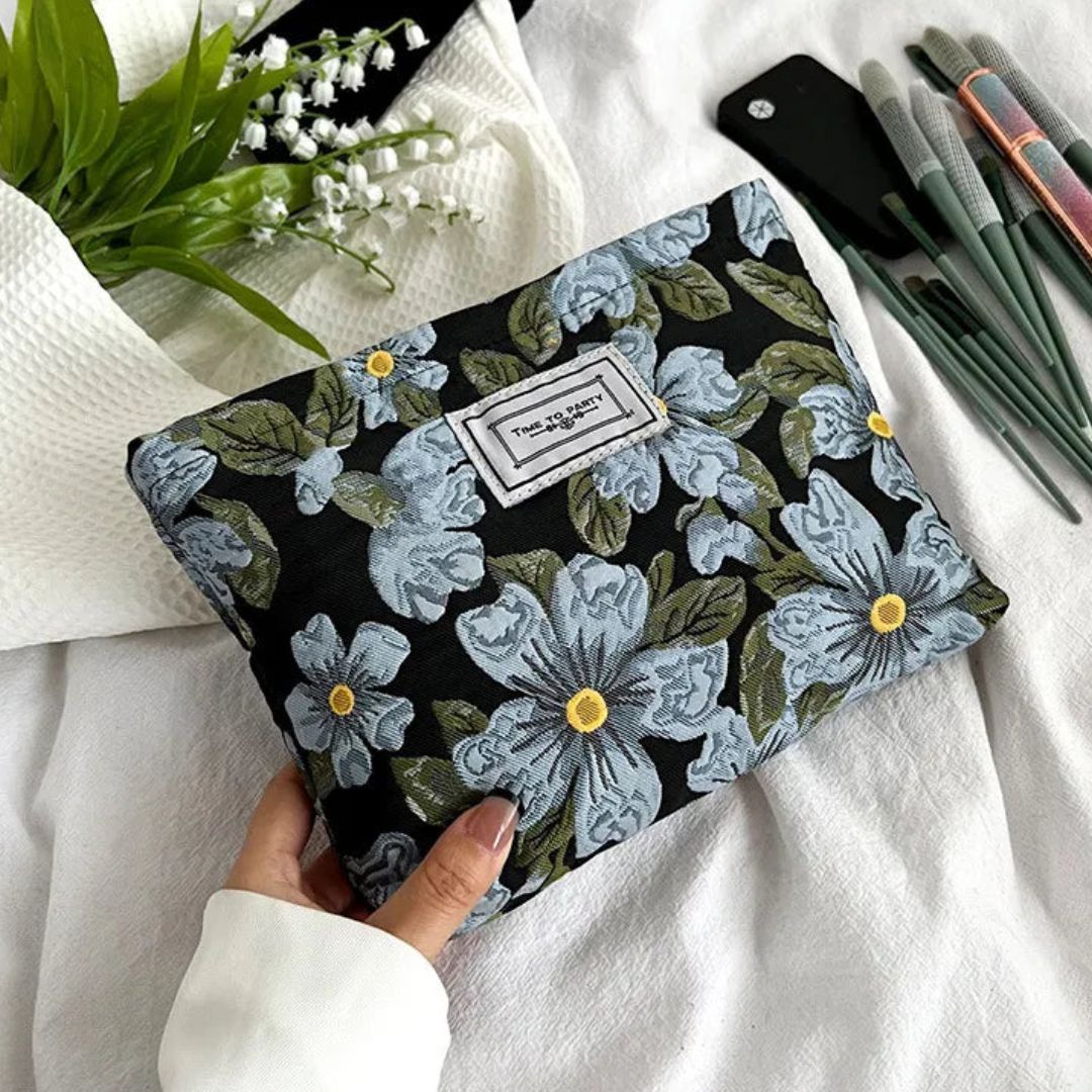 Le contraste élégant du fond noir avec les fleurs bleues ou blanches donne au design de la trousse fleurie un caractère intemporel qui capte le regard et s’accorde à toutes les saisons. Avec ses motifs floraux, cette trousse allie esthétisme et praticité.