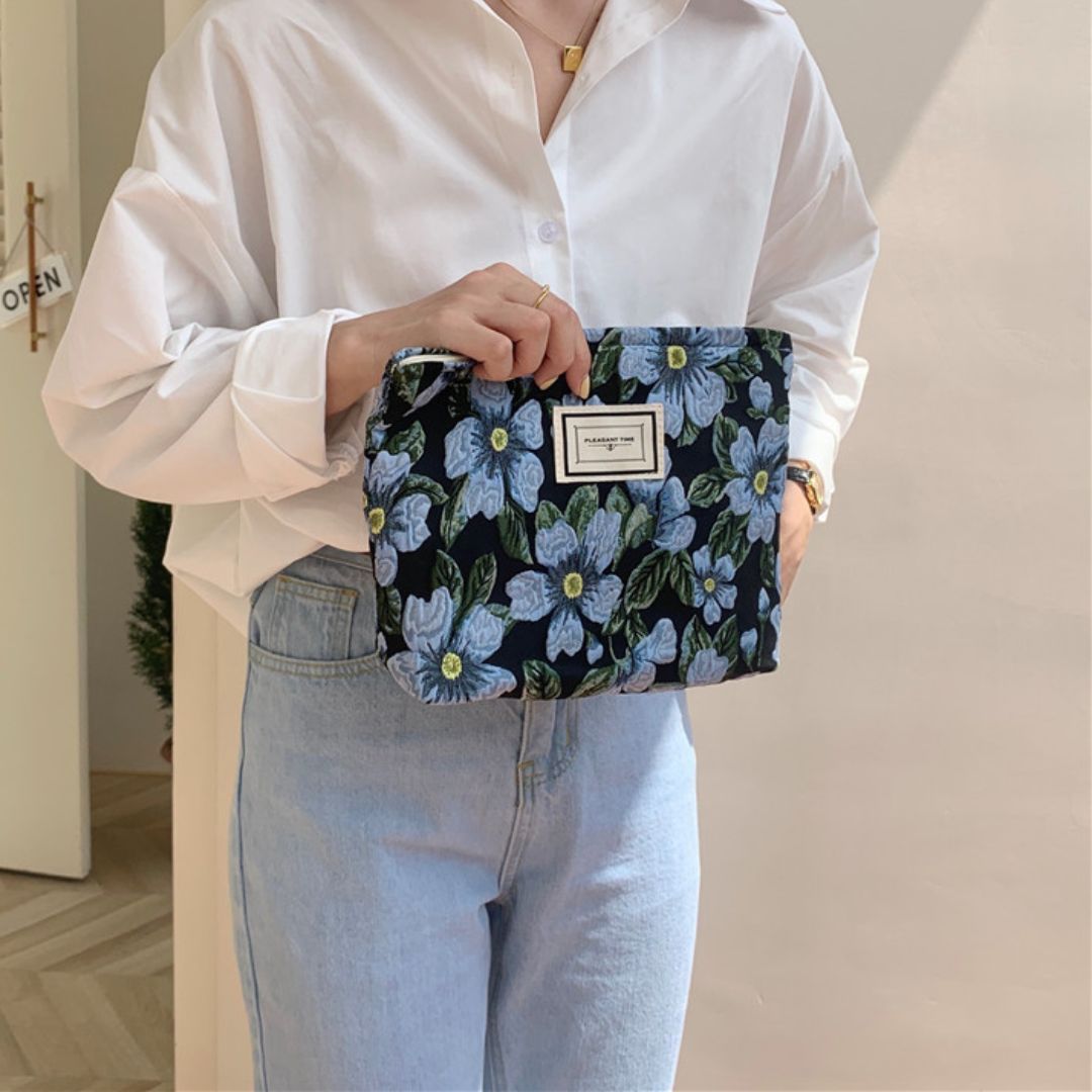Sélectionnez la version qui vous ressemble, fleurs bleues ou blanches sur fond noir, et glissez-la dans votre sac dès maintenant. Optez pour la trousse fleurie pour illuminer vos moments quotidiens.
