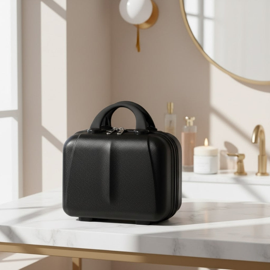 Ce vanity rigide s’adapte facilement à vos bagages grâce à sa bande de fixation arrière, idéale pour le poser sur une valise à roulettes. Sa poignée ergonomique assure un transport confortable, tandis que sa structure légère offre une excellente résistance. À la fois solide, fonctionnel et raffiné, il deviendra vite un indispensable de vos voyages, combinant sérénité, ordre et élégance.