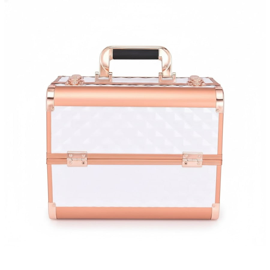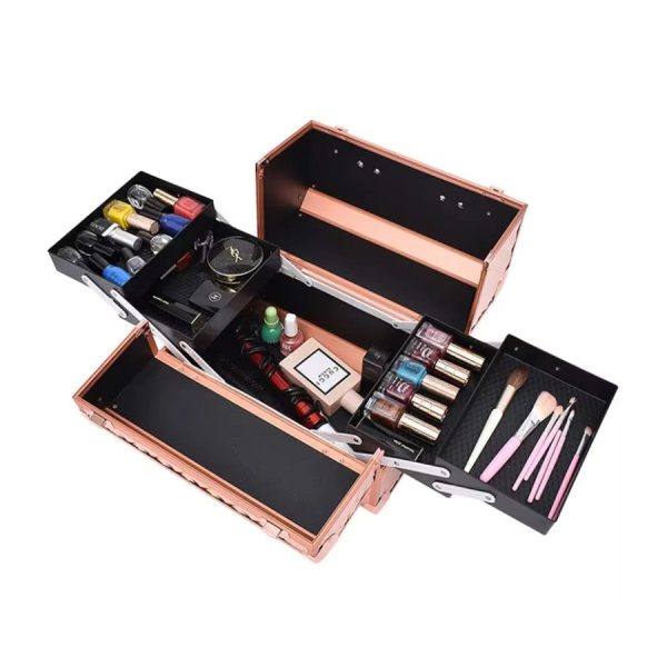 Grâce à son système de plateaux à étages, ce vanity de maquillage professionnel facilite le tri de vos outils, pinceaux, vernis ou palettes. L’intérieur antidérapant protège vos produits et empêche tout glissement pendant le transport. Les finitions métalliques dorées et le revêtement texturé créent une esthétique moderne, à la fois professionnelle et raffinée.