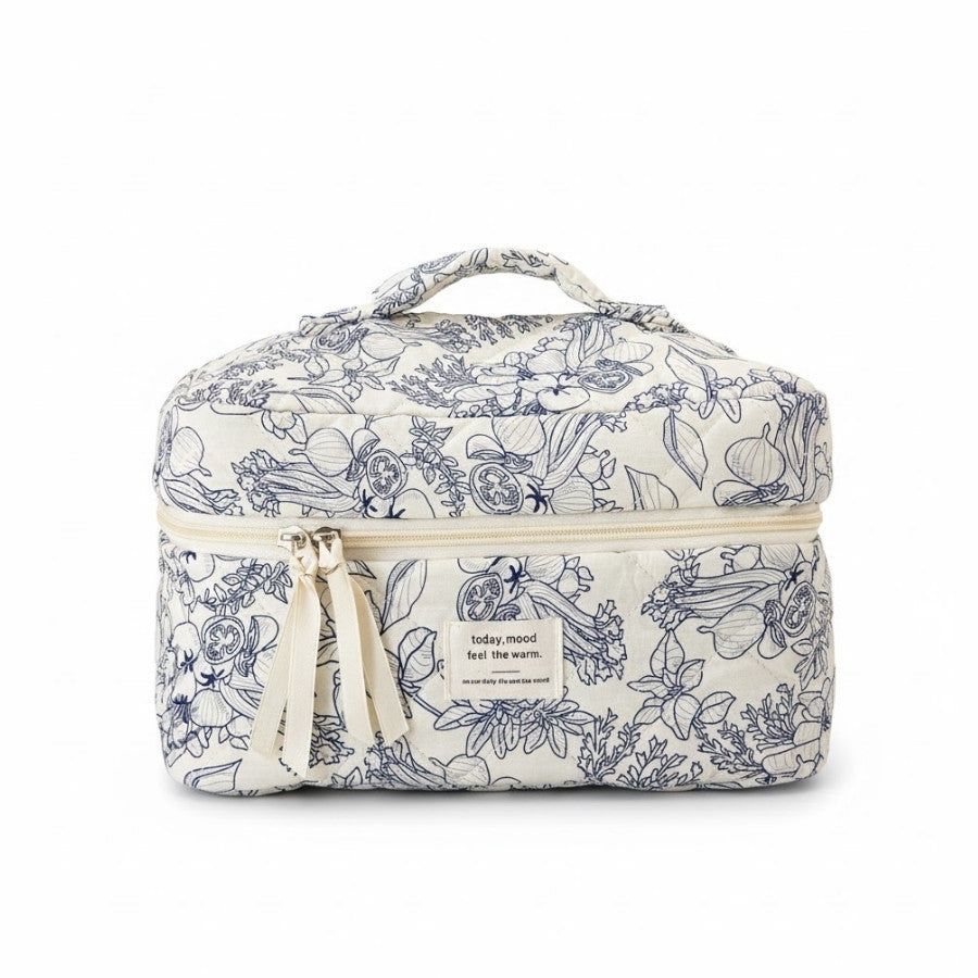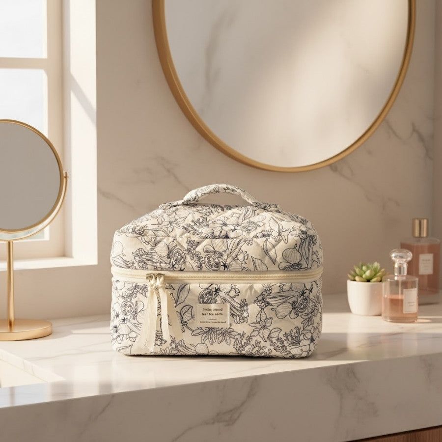 Original et raffiné, le Vanity Motifs Fruits et Légumes séduit par son design inattendu mêlant douceur et caractère. Ses illustrations fines de fruits et de plantes apportent une touche artistique unique à votre routine beauté. Son tissu matelassé offre un toucher agréable et protège vos essentiels tout en conservant un aspect élégant et naturel.