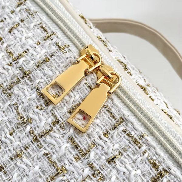 Élégant et fonctionnel, le Vanity Tissu Femme – Tweed séduit par son style haute couture et son design texturé en tweed blanc et doré. Sa conception rembourrée protège vos produits de beauté tout en conservant une allure chic et moderne pour un look tendance aussi bien en hiver qu’en été. Compact et raffiné, il se glisse aisément dans une valise ou s’expose avec élégance sur une coiffeuse, parfait pour les voyages comme pour le quotidien.